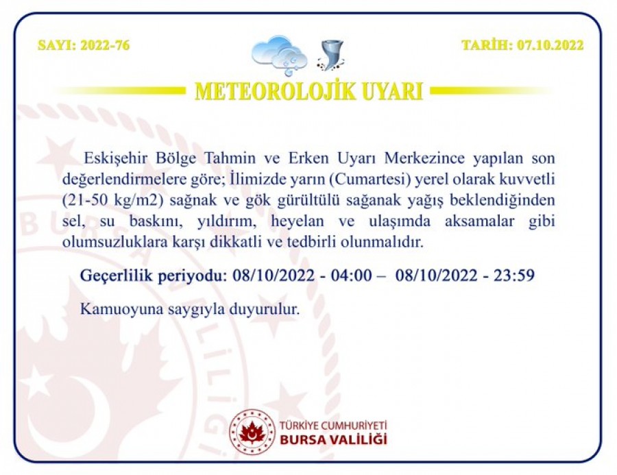 Yapılan son değerlendirmelere göre; 08.10.2022 Cumartesi (bugün) Kastamonu, Kocaeli, Bilecik çevreleri ile Bursa'nın doğusunda kuvvetli (21-50 kg/m2); Sakarya, Bolu, Düzce, Bartın, Zonguldak ve Karabük çevrelerinde yerel olarak çok kuvvetli ve şiddetli (50-100kg/ m2) sağanak ve gök gürültülü sağanak yağış beklendiğinden sel, su baskını, yıldırım, heyelan, ulaşımda aksamalar gibi olumsuzluklara karşı dikkatli ve tedbirli olunmalıdır.