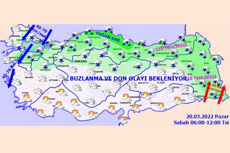 Ülkemiz genelinin parçalı ve çok bulutlu, Marmara'nın güney ve doğusu, Karadeniz, İç Anadolu'nun güney ve doğusu, Doğu Anadolu'nun kuzey ve doğusu ile Kırklareli, Tekirdağ, Kütahya ve Siirt çevrelerinin karla karışık yağmur ve kar yağışlı geçeceği tahmin ediliyor. Yağışların; sabah saatlerinde Kastamonu kıyıları, Sinop ve Samsun çevrelerinde, öğle saatlerinde ise Ordu çevrelerinde kuvvetli ve yer yer yoğun kar şeklinde olması bekleniyor.