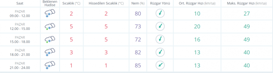 Çok bulutlu, bölgenin kuzey ve doğusunun aralıklı kar yağışlı geçeceği tahmin ediliyor. Rüzgarın; bölgenin güneydoğu kesimlerinde güney ve güneybatı yönlerden kuvvetli olarak (40-60 km/saat) esmesi bekleniyor. Bölge genelinde buzlanma ve don olayı ile birlikte yüksek kar örtüsü bulunan eğimli yamaçlarında çığ tehlikesi bulunmaktadır.