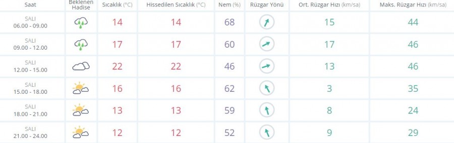 Çok bulutlu, bölge genelinin sağanak yağışlı geçeceği tahmin ediliyor. Rüzgârın, bölgenin iç kesimlerinde güney ve güneybatı (Lodos) yönlerden kuvvetli (40-70 km/saat) esmesi bekleniyor.