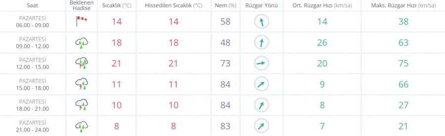 Parçalı ve çok bulutlu, bölge genelinin aralıklı sağanak ve gök gürültülü sağanak yağışlı geçeceği tahmin ediliyor.Yağışların; İzmir, Aydın, Manisa, Uşak, Kütahya, Afyonkarahisar ve Muğla'nın iç kesimlerinde yerel olarak kuvvetli olacağı tahmin ediliyor. Rüzgarın; güney ve güneybatı zamanla kuzeybatı yönlerden kuvvetli ve kısa süreli fırtına (40-60 km/sa, yer yer kısa süreli 70-80 km/sa) şeklinde esmesi bekleniyor.