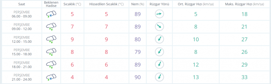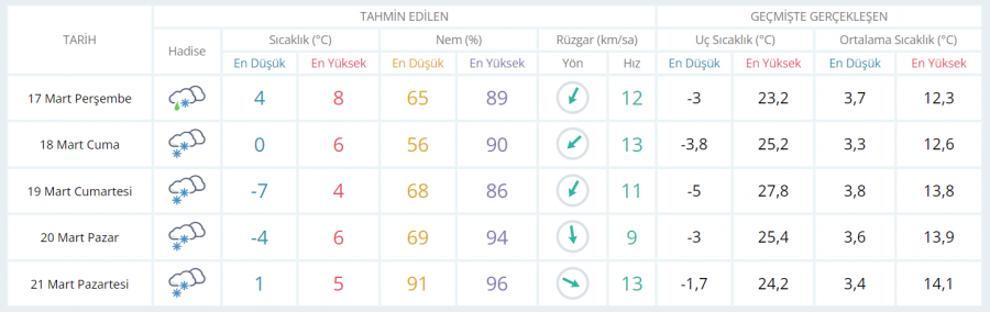 Meteoroloji Genel Müdürlüğü tarafından yapılan son değerlendirmelere göre: Ülkemiz genelinin parçalı ve çok bulutlu, Marmara, İç Ege, Batı ve Orta Akdeniz'in iç kesimleri, İç Anadolu, Karadeniz, Doğu Anadolu'nun kuzeyi, Güneydoğu Anadolu'nun batısı ile Hatay, Osmaniye, Kahramanmaraş ve Malatya çevrelerinin yağışlı geçeceği tahmin ediliyor. Yağışların, genellikle karla karışık yağmur ve Kar, Marmara, Doğu Akdeniz ve Güneydoğu Anadolu'nun batısında yağmur ve sağanak şeklinde görülmesi, akşam saatlerinde Trabzon'un doğusu ile Rize ve Artvin çevrelerinde kuvvetli olması bekleniyor. Karadeniz'in iç ve yüksek kesimleri ile Doğu Anadolu'da yüksek kar örtüsüne sahip eğimli bölgelerde çığ riski bulunmaktadır. Kuzey, iç ve doğu kesimlerde buzlanma ve don olayı ile birlikte yer yer pus ve sis bekleniyor.