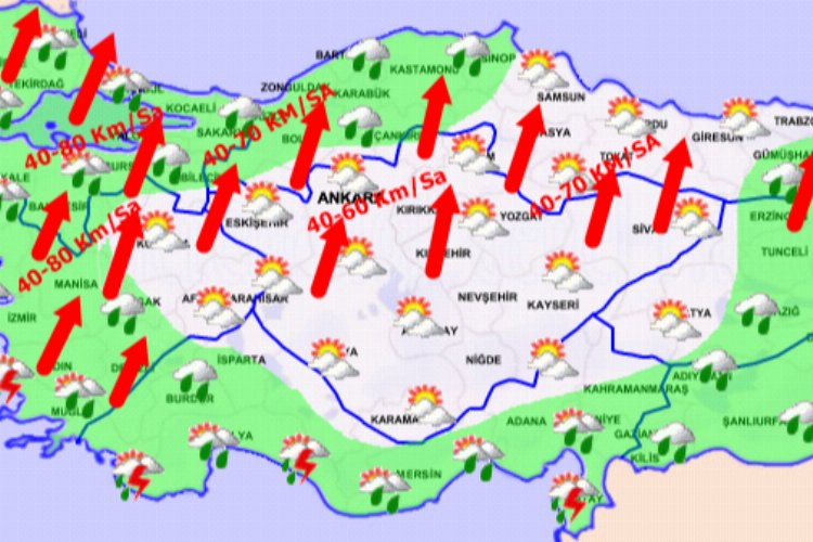 RÜZGAR: Genellikle güney yönlerden hafif, ara sıra orta kuvvette, Marmara, Ege, Batı ve Orta Karadeniz Bölgeleri ile İç Anadolu'nun kuzeyi ve Doğu Karadeniz'in iç kesimlerinde güney ve güneybatı yönlerden kuvvetli (40-60 km/sa), Marmara ve Kuzey Ege'de zaman zaman kısa süreli fırtına (70-80 km/sa) şeklinde esmesi bekleniyor.