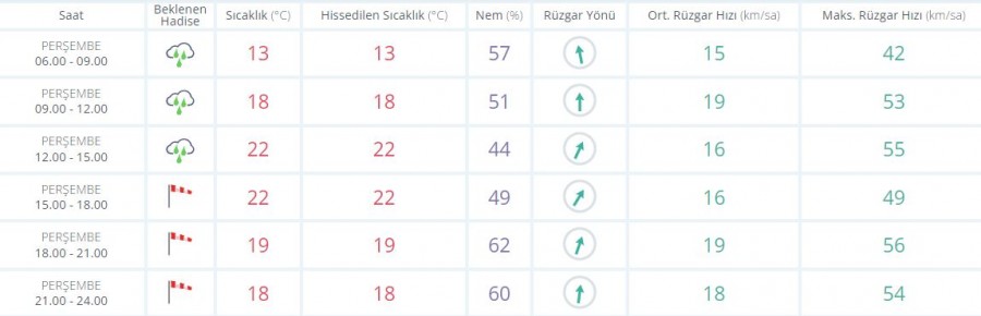Hava Durumu: Parçalı ve çok bulutlu, aralıklı sağanak yağışlı; Rüzgar: Güney ve güneybatıdan 5 ila 7 kuvvetinde; Dalga: 0,5 ila 1,5 m, gece saatlerinden itibaren yer yer 2,5 m; Görüş: İyi, yağış anında orta.