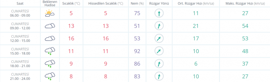 Çok bulutlu ve aralıklı yağmurlu, akşam saatlerinde yüksekleri karla karışık yağmur ve yer yer kar yağışlı geçeceği tahmin ediliyor. Yağışların akşam saatlerinde yerel olmak üzere kuvvetli olması bekleniyor.