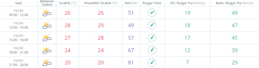 Hava sıcaklıklarının doğu kesimlerde biraz artacağı, diğer yerlerde önemli bir değişiklik olmayacağı, güneydoğu kesimlerde mevsim normallerinin üzerinde, diğer yerlerde mevsim normalleri civarında seyredeceği tahmin ediliyor. Rüzgarın genellikle kuzey ve kuzeydoğu, Akdeniz kıyıları ile güneydoğu kesimlerde batı ve güneybatı yönlerden hafif, ara sıra orta kuvvette, Marmara'nın güneybatısı ile yağış alan yerlerde yağış anında kuvvetli (40-60 km/sa) olarak esmesi bekleniyor.