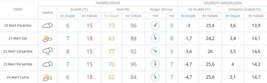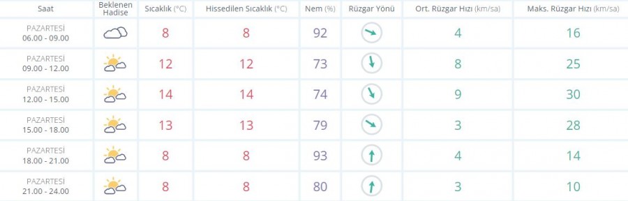 Meteoroloji Genel Müdürlüğü tarafından yapılan son değerlendirmelere göre: Ülkemiz genelinin parçalı ve çok bulutlu, Doğu Akdeniz, İç Anadolu, Karadeniz, Doğu ve Güneydoğu Anadolu ile Kocaeli, Sakarya, Yalova, Bursa, Bilecik, Afyonkarahisar, Kütahya ve Isparta çevrelerinin yağışlı geçeceği tahmin ediliyor. Genellikle yağmur ve sağanak, Orta ve Doğu Karadeniz’in iç kesimleri, İç Anadolu’nun kuzeydoğusu ile Doğu Anadolu’nun kuzey ve doğusunun yükseklerinde karla karışık yağmur ve kar şeklinde görülmesi beklenen yağışların; Konya, Karaman, Kırşehir, Nevşehir, Aksaray, Sivas, Samsun, Ordu, Giresun ve Erzincan çevrelerinde yer yer kuvvetli olması bekleniyor. Gece ve sabah saatlerinde iç ve doğu kesimlerde buzlanma ve don olayı bekleniyor. Doğu Karadeniz’in iç kesimleri ile Doğu Anadolu’nun eğimli ve yüksek kesimlerinde çığ tehlikesi riski bulunmaktadır.