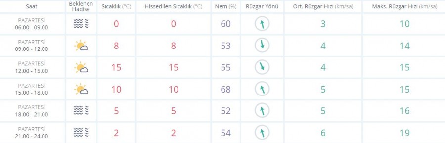 Hava Durumu: Parçalı ve az bulutlu, Rüzgar: Batı Akdeniz'de doğu ve kuzeydoğu, akşam saatlerinden sonra güneybatıdan 3 ila 5, Doğu Akdeniz'de doğu ve kuzeydoğudan 3 ila 5, doğusunun açıkları 6 kuvvetinde, Dalga: 1,0 ila 2,0m, doğusunun açıkları 2,5m, Görüş: İyi.