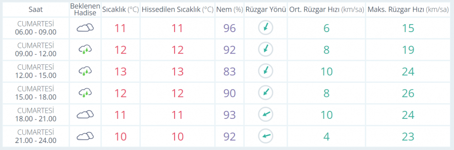 Meteoroloji Genel Müdürlüğü tarafından yapılan son değerlendirmelere göre: Ülkemizin kuzey, iç ve doğu kesimlerinin parçalı ve çok bulutlu, (Çanakkale hariç) Marmara, (Çorum hariç) Karadeniz, Doğu Anadolu'nun kuzeydoğusu, Muğla, Uşak, Sivas ve Yozgat ile Eskişehir'in ve Ankara'nın kuzey, Çanakkale'nin doğu, Kütahya'nın batı ve kuzey çevrelerinin yağmur ve sağanak, Doğu Anadolu'nun kuzeydoğusu ve Doğu Karadeniz'in iç kesimlerinin karla karışık yağmur ve kar yağışlı geçeceği tahmin ediliyor. Gece ve sabah saatlerinde iç kesimlerde yer yer pus ve sis bekleniyor.