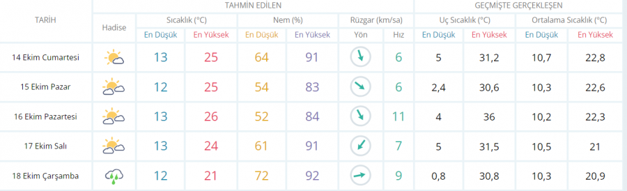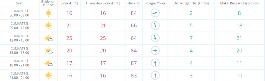 Meteoroloji Genel Müdürlüğü tarafından yapılan son değerlendirmelere göre: Ülkemizin güneybatı kesimlerinin parçalı, yer yer çok bulutlu, Muğla, Denizli ve Isparta ile Antalya'nın çevre ilçelerinin yerel sağanak ve gök gürültülü sağanak yağışlı, diğer yerlerin az bulutlu ve açık geçeceği tahmin ediliyor. Gece ve sabah saatlerinde Marmara'nın güney ve doğusu, İç Ege ile Karadeniz'in iç kesimlerinde pus ve yer yer sis bekleniyor.