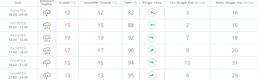 Yapılan son değerlendirmelere göre, yurdun kuzey ve batı kesimlerinin parçalı ve yer yer çok bulutlu, Marmara, Ege, Batı Akdeniz, İç Anadolu'nun kuzeybatısı, Batı ve Orta Karadeniz (Tokat hariç), Doğu Karadeniz'in kıyı kesimi ile Yozgat, Van, Bitlis, Siirt, Şırnak ve Hakkari çevrelerinin sağanak ve yer yer gök gürültülü sağanak yağışlı, diğer yerlerin az bulutlu geçeceği tahmin ediliyor. Yağışların; Marmara'nın güney ve batısı, Ege, İç Anadolu'nun kuzeybatısı, Batı Karadeniz'in iç kesimleri ile Isparta çevrelerinde yerel olarak kuvvetli, Antalya'nın doğu kesimlerinde kuvvetli ve yer yer çok kuvvetli olması bekleniyor.