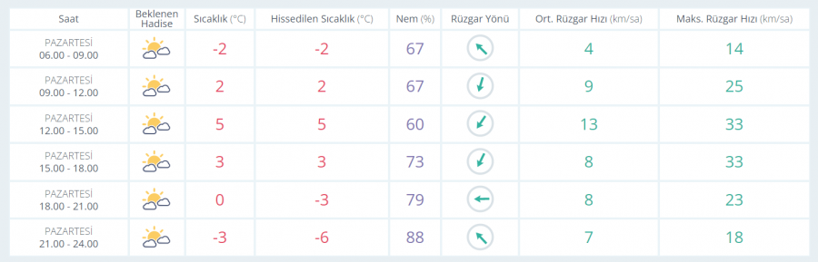 Meteoroloji Genel Müdürlüğü tarafından yapılan son değerlendirmelere göre: Ülke genelinin parçalı ve çok bulutlu, batısının zamanla az bulutlu, Marmara'nın doğusu, İç Anadolu’nun kuzeydoğusu, Karadeniz, Doğu ve Güneydoğu Anadolu Bölgesi ile Osmaniye ve Kahramanmaraş çevrelerinin karla karışık yağmur ve kar yağışlı, İstanbul ve Hatay çevrelerinin yağmurlu geçeceği tahmin ediliyor. Yağışların, Doğu Karadeniz kıyıları, Ordu, Ağrı, Muş, Bitlis ve Hakkâri çevrelerinde yerel kuvvetli ve yer yer yoğun kar şeklinde olması bekleniyor. Karadeniz'in iç ve yüksek kesimleri ile Doğu Anadolu'da yüksek kar örtüsüne sahip eğimli bölgelerde çığ riski bulunmaktadır. Ülkemiz genelinde buzlanma ve don olayı bekleniyor.