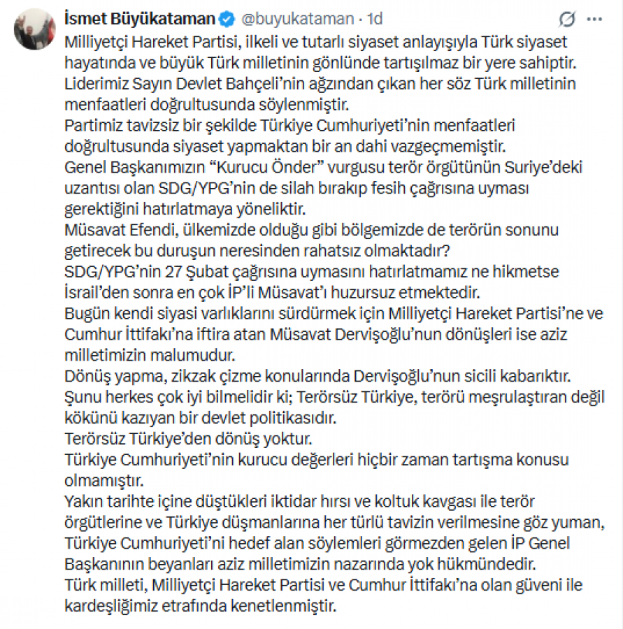 Bugün kendi siyasi varlıklarını sürdürmek için Milliyetçi Hareket Partisi'ne ve Cumhur İttifakı'na iftira atan Müsavat Dervişoğlu'nun dönüşleri ise aziz milletimizin malumudur.