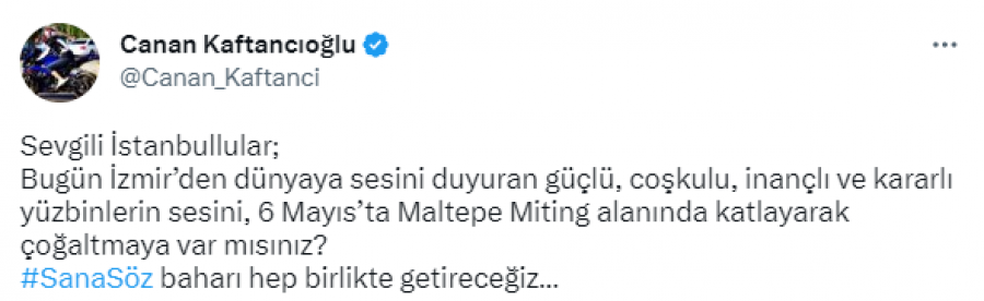 CHP İstanbul İl Başkanı Canan Kaftancıoğlu, yaptığı sosyal medya paylaşımı ile mitingin 6 Mayıs Cumartesi günü yapılacağını açıkladı.