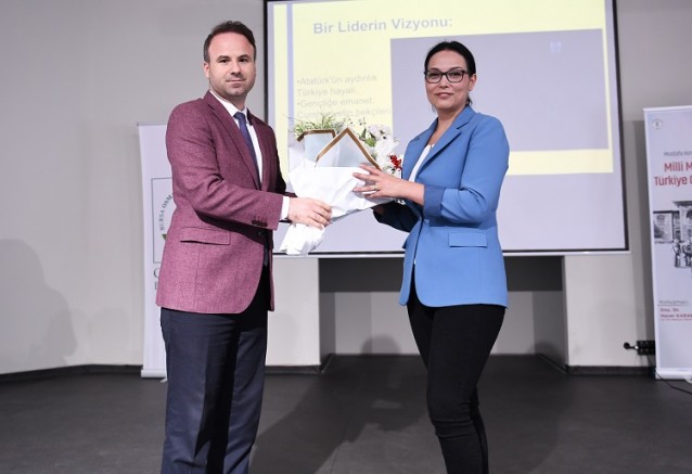 Öğrencilerin büyük ilgi gösterdiği panelde Mustafa Kemal Atatürk’ün harp ustası olduğunu belirten Doç. Dr. Hacer Karabağ Arslan, milli mücadele döneminde yaşanan ibret verici olayları örneklerle anlattı. Arslan, “Mustafa Kemal Atatürk der ki, savaş sadece cephede kalırsa başarısızlık kaçınılmaz olur. Savaşı evinde oturan, tarlasını işleten, dükkanını çalıştıran, kadın, erkek, genç ve yaşlı herkesin hissetmesi lazım. Zafer ancak böyle gelir. Türk Milleti, kadın, erkek, genç ve yaşlısıyla hatta kimi yerde çocuklarıyla mücadele verir. Bir gazete kupüründen örnek vereyim Bursa’da Kuvacı İslam 12 yaşında Yunan işgali sırasında Hâkimiye-i Milliye Gazetesi’ne Şubat 1920 tarihinde haber oluyor. Kuvacı İslam Bursa işgal edilince arkadaşlarıyla birlikte dağa çıkarak dönemin Bursa’daki işgal kuvvetleri komutanına bir mektup yazıyorlar. Mektupta şu satırları yazıyorlar, ‘Şimdi biz gidiyoruz ama ordumuzla beraber geri döneceğiz’. Mustafa Kemal Atatürk de şöyle diyor; ‘Cumhuriyet demek sadece bir rejim değişikliği değildir. Cumhuriyet vatan, dalgalanan bayrak, bağımsızlık ve uğruna on binlerce verilmiş şehit demektir” ifadelerini kullandı.