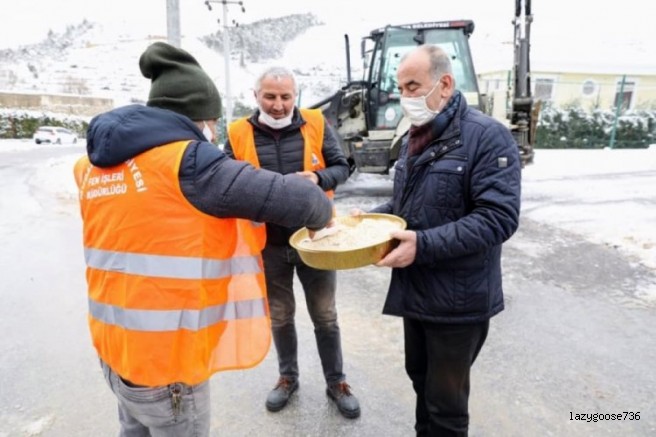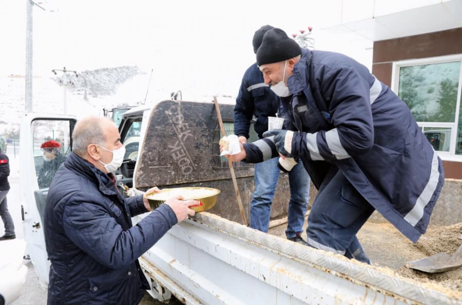Ulaşımda herhangi bir problem oluşmaması için kar küreme ve tuzlama çalışmalarına ara vermeden devam eden ekiplerle sohbet eden Türkyılmaz, çalışanlara çay ve helva ikramı yaptı.
