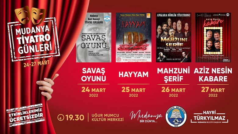 Mudanya Belediyesi, 24-27 Mart tarihlerinde 4 farklı oyunu tiyatroseverlerle buluşturuyor. Mudanya Tiyatro Günleri kapsamında Mudanya Kent Konseyi oyuncuları “Savaş Oyunu” ile 24 Mart’ta, Ekim Sanat oyuncuları “Hayyam” ile 25 Mart’ta, Ankara Birlik Tiyatrosu oyuncuları “Mahzuni Şerif” ile 26 Mart’ta, İzmir Halk Tiyatrosu oyuncuları “Aziz Nesin Kabare” ile 27 Mart’taUğur Mumcu Kültür Merkezi’nde seyirciyle buluşacak. Mudanya Tiyatro Günleri etkinlikleri kapsamında Cengiz Toraman’ın yönettiği Levent Üzümcü, Ali Hakan Beşen, Mehmet Küçükgünaydın ve Cengiz Toraman’ın sahnelediği “Aziz Nesin Kabare”, Ali Öztunç’un yazdığı, Gül Göker’in oyunlaştırdığı, Murat Sarı’nın yönettiği “Mahzuni Şerif”, Ömer Naci Topçu’nun yazıp yönettiği “Hayyam” ile Mudanya tiyatroya doyacak.
