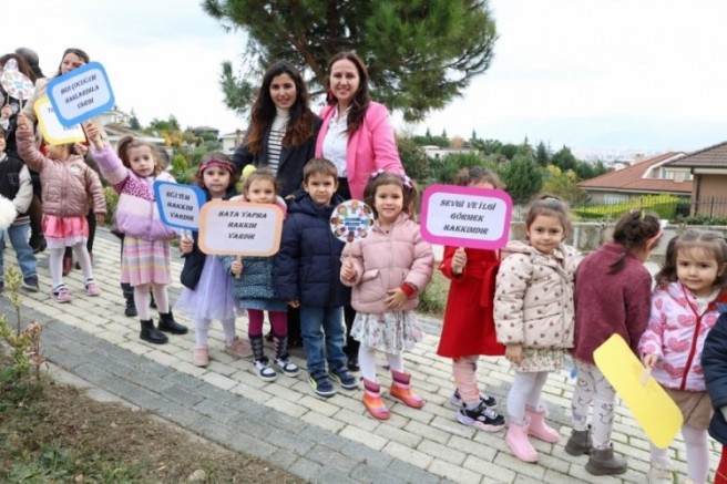 20 Kasım Dünya Çocuk Hakları Günü, Bursa Mudanya'da çocukların seslerini duyurduğu anlamlı etkinliklere sahne oldu. Mudanya Belediyesi ve Mudanya Kent Konseyi'nin işbirliğiyle "Hayallerimiz Hakkımızdır" temasıyla düzenlenen etkinliklerde, çocuklar eşitlik, güvenlik ve özgürlük taleplerini dile getirdiler. Zübeyde Ana Çocuk Akademisi'nde düzenlenen etkinliklere Mudanya Belediye Başkan Yardımcısı Av. Baran Güneş, CHP İlçe Başkanı Furkan Atalay, Mudanya Kent Konseyi Başkanı Ozan Kozan, belediye meclis üyeleri, öğretmenler, öğrenciler ve aileler katıldı. Kreş bahçesinde ellerinde "Ben Çocuğum, Haklarımla Varım" dövizleri taşıyarak yürüyüş yapan ve haklarını savunan minikler, daha sonra "Her Çocuk Bir Fidan" temasıyla fidanlarını toprakla buluşturdular. Öğrencilerin UNICEF atölye çalışmalarında yaptıkları eğitim, barınma, beslenme ve sağlık hakkını ele alan resimleri ise beğeniyle izlendi. Masal etkinlikleriyle de hayal dünyalarını genişleten çocuklar, "Kaybolan Renkler Masalı" sayesinde okumanın önemi üzerine eğitici bir deneyim yaşadılar.