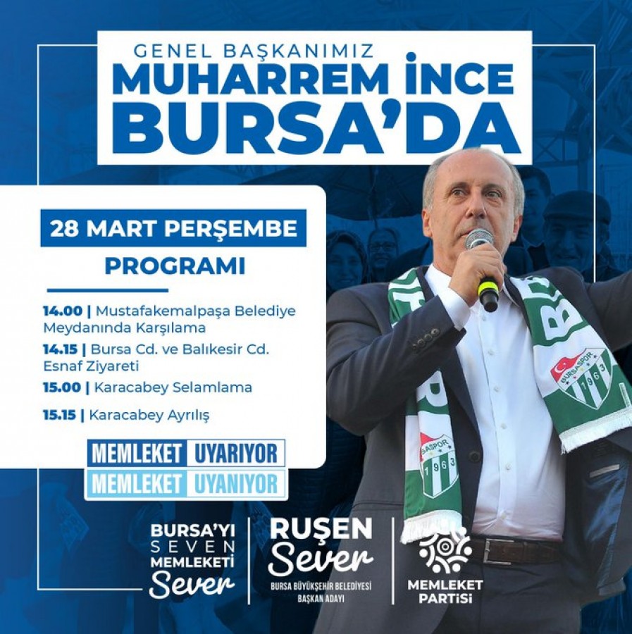 Memleket Partisi Genel Başkanı Muharrem İnce, 28 Mart Perşembe günü yerel seçim çalışmaları kapsamında bir dizi program için Bursa'ya geliyor.