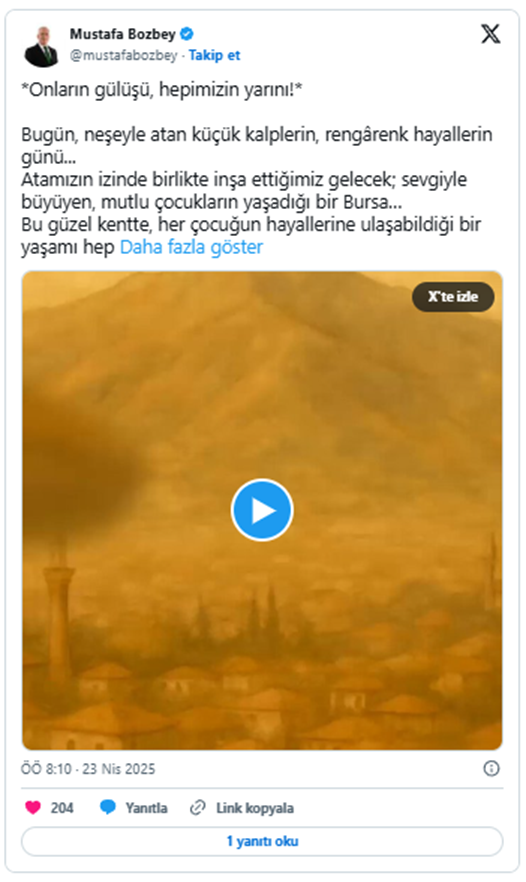 "Onların gülüşü, hepimizin yarını! Bugün, neşeyle atan küçük kalplerin, rengârenk hayallerin günü... Atamızın izinde birlikte inşa ettiğimiz gelecek; sevgiyle büyüyen, mutlu çocukların yaşadığı bir Bursa... Bu güzel kentte, her çocuğun hayallerine ulaşabildiği bir yaşamı hep birlikte büyütüyoruz. Nice 23 Nisanlarda birlikte gülümsemek dileğiyle... Ulusal Egemenlik ve Çocuk Bayramımız kutlu olsun."