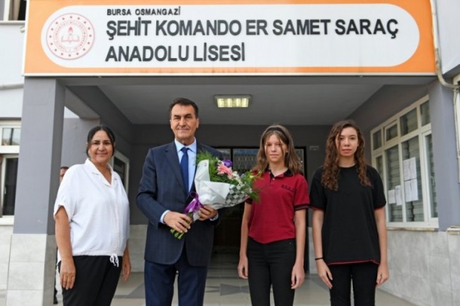 Başkan Dündar, 2023-2024 eğitim öğretim yılının ilk gününden itibaren başladığı okul ziyaretlerine yeni haftada da devam ediyor. Soğanlı Mahallesi'ndeki Şehit Samet Saraç Anadolu Lisesi'nde öğrencilerle bir araya gelen Dündar, Osmangazi Belediyesi'nin hayatın her alanında olduğu gibi eğitim alanında önemli projelere imza attığını söyledi. Osmangazi'de 254 okulda 187 bin öğrenci, 11 bin öğretmen olduğunu hatırlatan Başkan Dündar, "Osmangazi olarak her ferdi, her kurumuyla büyük bir aileyiz. Bu ailenin mutlu ve huzurlu olabilmesi için önemli çalışmalar gerçekleştiriyoruz. Belediye olarak eğitimin kalitesini artırmak adına elimizden gelen gayreti gösteriyoruz. Bütün okullarımıza ihtiyaç ve taleplere göre desteğimizi sürdürüyoruz. Her okulda bir taşımız, bir izimiz vardır. Bizler, öğrencilerimizi ve gençlerimizi görünce geleceğe umutla bakıyoruz. Bu ülkenin geleceği sizlersiniz. Sizlere en iyi şartları sunuyoruz. Size düşen görev, çok çalışmak. Çalışıyorsak, istiyorsak başarırız. Hedeflerimize doğru giderken, üşenmiyoruz, ertelemiyoruz ve vazgeçmiyoruz. Allah hepinize zihin açıklığı versin" dedi.
