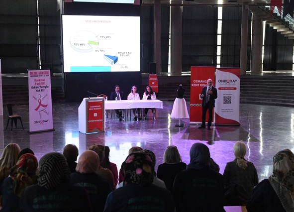 Panorama 1326 Bursa Fetih Müzesi’nde gerçekleşen etkinliğe Osmangazi Belediye Başkan Yardımcısı Mutlu Esendemir’in yanı sıra Osmangazi Kent Konseyi Başkanı Fatma Çil Yılmaz, Uludağ Onkoloji Dayanışma Derneği Başkanı Füsun Önen ve çok sayıda kadın personel katılım gösterdi. Müzik dinletisiyle başlayan programda Uludağ Üniversitesi Tıbbi Onkoloji Bilim Dalı Başkanı Prof. Dr. Türkkan Evrensel, Genel Cerrah Operatör Dr. Coşkun Özer, Psikolog Gönül Hazneci ile Eğitim Hemşiresi Elif Pişkin ise erken teşhisin önemine dikkat çekerek kadınlara hayati bilgiler verdi.