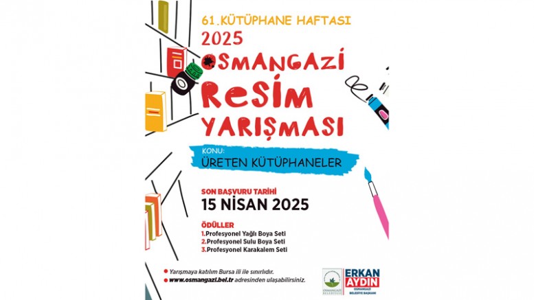 Osmangazi Belediyesi, çocukların kütüphanelere ve kitaba olan ilgisini arttırmanın yanı sıra sanatsal yeteneklerini keşfetmelerine destekte bulunmak adına ‘Üreten Kütüphaneler’ konulu resim yarışması düzenliyor. 61. Kütüphane Haftası etkinlikleri kapsamında düzenlenen yarışmaya, Bursa’daki tüm ortaokul öğrencileri başvuru yapabilecek. Kendi anlatım biçimine göre her türlü tekniği ve malzemeyi kullanmakta serbest olan öğrenciler, yarışmaya en fazla bir eser ile katılabilecek. Yarışmaya katılan resimlerin daha önce herhangi bir yarışmaya katılmamış ve herhangi bir yerde yayınlanmamış, sergilenmemiş özgün bir çalışma olması gerekiyor. Ortaokul öğrencileri, en geç 15 Nisan 2025 tarihine kadar eserlerini Osmangazi Belediyesi’ne ait kütüphanelere ulaştırabilir. Yarışmaya katılmak isteyen öğrenciler, şartname ve detaylı bilgiye www.osmangazi.bel.tr adresi üzerinden ulaşabilecek. Yarışmanın ödül töreni, 18 Nisan 2025 Cuma günü İsmail Hakkı Tonguç Bağış Kütüphanesi’nde yapılacak. Yarışmada dereceye giren öğrenciler, çeşitli hediyelerin sahibi olacak.