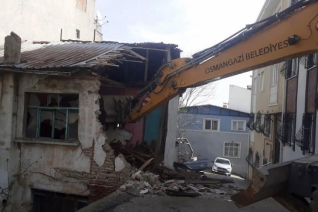 Osmangazi Belediyesi, halkın can ve mal güvenliğini tehdit etmesinin yanı sıra madde bağımlılarının mesken tutması nedeniyle de yoğun şikayetlere konu olan metruk binaları tek tek yıkıyor. Osmangazi Belediyesi'nin metruk binaların yıkımına yönelik gerçekleştirdiği çalışmalar vatandaşlar tarafından da takdirle karşılanıyor. İlçedeki metruk binaların oluşturduğu riskleri ortadan kaldırmak ve çevreye zarar veren unsurlara engel olmak amacıyla harekete geçen Yapı Kontrol Müdürlüğü ekipleri, son olarak İvazpaşa Mahallesi'nde bulunan bir metruk binayı yıktı. Yıkımın ardından ortaya çıkan molozlar, belediye ekipleri tarafından kamyonlara yüklenerek yıkım alanı temizlendi.