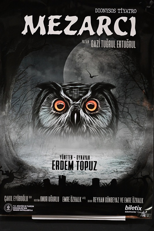 Mezarcı Oyunu; Sisli ve puslu bir kasabanın mezarlığında yaşamı ve varoluşu sorgulayan bir Mezarcı. Kanatsız bir kuş gibi uçmaya çalışan uçamayan insan, tökezleyen, düşen. Baykuş görünümünde insanı anlatıyor. Derin anlam içeren zor metin, oyuncuya zorlayıcı olduğu kadar keyifli bir performans imkanı sunuyorken benzer bir zorlayıcılıkla seyircinin de dikkat seviyesini en üst seviyeye çekiyor. Dionysos Tiyatro'dan Karşı Gerçekçi bir oyun. Bir kasaba mezarlığının mezarcısının gözünden ölüme ve yaşama aynı zamandan ve aynı yerden bakma denemesi.
