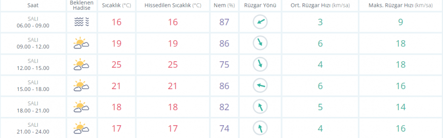 Meteoroloji Genel Müdürlüğü tarafından yapılan son değerlendirmelere göre: Ülkemizin batı kesimlerinin parçalı ve yer yer çok bulutlu, Ege Bölgesi ile Batı Akdeniz'in yerel olmak üzere sağanak ve gök gürültülü sağanak yağışlı, diğer yerlerin az bulutlu ve açık geçeceği tahmin ediliyor. Gece ve sabah saatlerinde iç ve doğu kesimlerde yer yer pus ve sis bekleniyor.