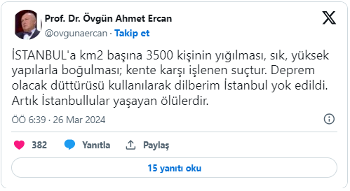 Sosyal medya hesabından paylaşımda bulunan Prof. Dr. Ercan, İstanbul'daki yoğunluğa tepki göstererek, "Deprem olacak düttürüsü kullanılarak dilberim İstanbul yok edildi. Artık İstanbullular yaşayan ölülerdir."