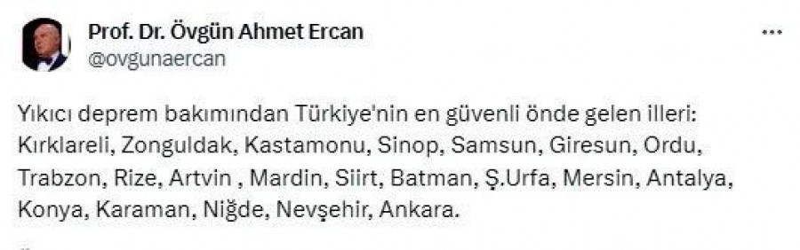 Ercan, yaptığı paylaşımda, "Yıkıcı deprem bakımından Türkiye'nin en güvenli önde gelen illeri: Kırklareli, Zonguldak, Kastamonu, Sinop, Samsun, Giresun, Ordu, Trabzon, Rize, Artvin , Mardin, Siirt, Batman, Ş.Urfa, Mersin, Antalya, Konya, Karaman, Niğde, Nevşehir, Ankara." ifadelerini kullandı.