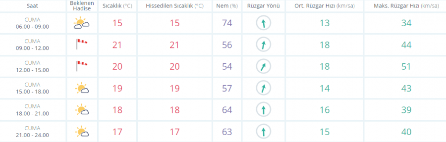 KUVVETLİ RÜZGÂR UYARISI: Rüzgârın Marmara ve Kuzey Ege'de güneyli yönlerden kuvvetli, zaman zaman kısa süreli fırtına şeklinde (40-60 km/saat) esmesi beklendiğinden yaşanabilecek olumsuzluklara karşı dikkatli ve tedbirli olunması gerekmektedir.