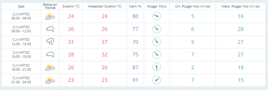Hava Durumu: Parçalı ve çok bulutlu, batısı ile akşam saatlerinden itibaren doğusu sağanak ve gök gürültülü sağanak yağışlı; Rüzgar: Batı Karadeniz'de batı ve güneybatıdan, batısı ile öğle saatlerinde geneli kuzeybatıdan 4 ila 6, akşam saatlerinden itibaren doğusu 7; Doğu Karadeniz'de batı ve kuzeybatıdan 3 ila 5, yer yer 6, akşam saatlerinden itibaren batısı 7 kuvvetinde; Dalga: 1,0 ila 2,0 m, Orta Karadeniz’de yer yer 3,0 m; Görüş: İyi, yağış anında orta.