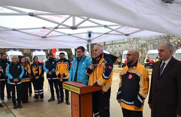 Törende konuşan İl Sağlık Müdürü Uzm. Dr. Mustafa Çetin, “Acil sağlık hizmetlerinin, ihtiyacı olan hastalara, 7 gün 24 saat kesintisiz bir şekilde ulaşmak, ilk müdahaleyi yapmak ve en uygun hastaneye nakletmek üzerine kurulu olduğunu belirtti. Bu sürecin insan gücü, araç ve ekipmanla yürütüldüğünü dile getiren Çetin, “Bu ihtiyaçları karşılamak amacıyla Bakanlığımızdan ilimize 17 adet ambulans gönderildi. İki tanesi 4X4 olmak üzere toplam 17 tam donanımlı ambulans ile filomuzu güçlendirdik ve ambulans sayımız 158’e çıktı.” şeklinde konuştu.
