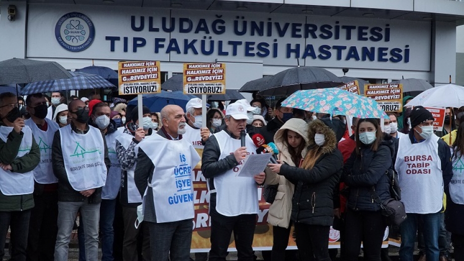 Bursa'da Sağlık ve Sosyal Hizmet Emekçileri Sendikası Bursa Şubesi, Bursa Tabib Odası, DEV Sağlık İş Sendikası, Genel Sağlık İş Sendikası haklarını savunmak için BUÜ TIP Fakültesi Hastanesi girişi önünde, 'G(ö)reve Çıkıyoruz' adlı bir basın açıklaması gerçekleştirdi.