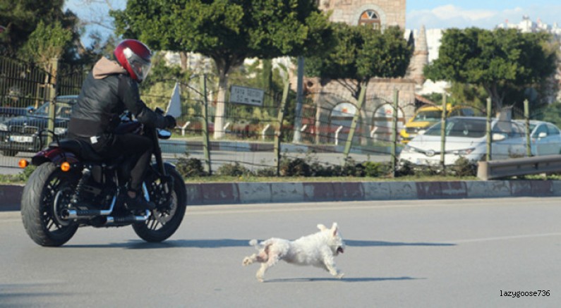 Köpeğin arkasına bakmadan hızla yolda gitmesi nedeni ile sürücüler köpeği arkasından takip etti.