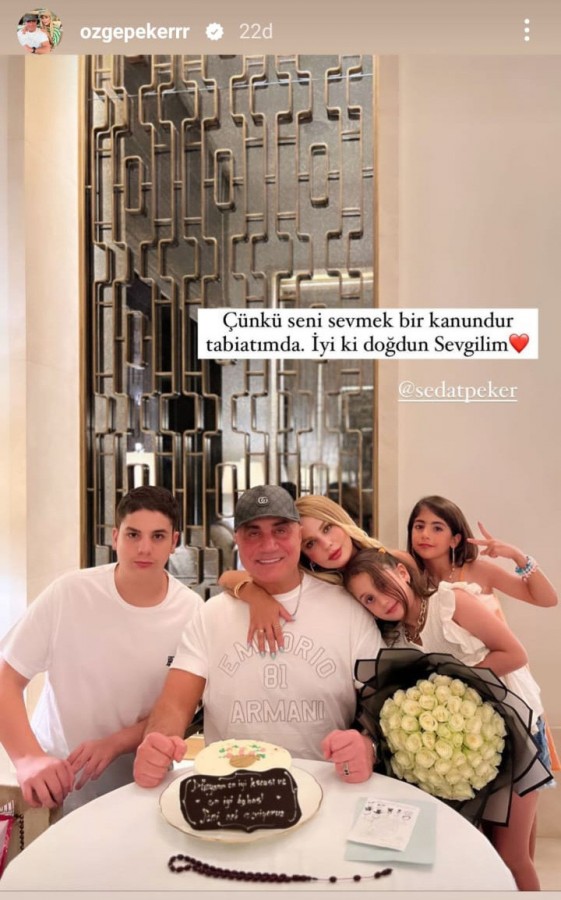 Özge Peker, Instagram'dan yaptığı paylaşımla eşi Sedat Peker'in doğum gününü kutladı. Eşi ve çocuklarıyla birlikte çekilen bir fotoğrafını yayınlayan Özge Peker, paylaşımına "Çünkü seni sevmek bir kanundur tabiatımda. İyi ki doğdun sevgilim" notu düştü.