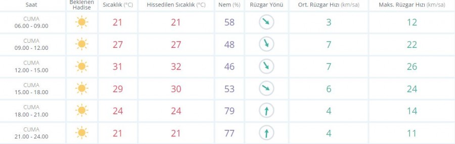 Hava Durumu: Az bulutlu ve açık, Rüzgar: Batı Akdeniz’de batı ve kuzeybatıdan, akşam saatlerine kadar doğusu güneybatıdan 3 ila 5, batısı yer yer 6; Doğu Akdeniz’de batı ve güneybatıdan, sabah saatlerinde kuzeydoğudan 3 ila 5 kuvvetinde, Dalga: 0,5 ila 1,5 m, batısı yer yer 2,5 m, Görüş: İyi.