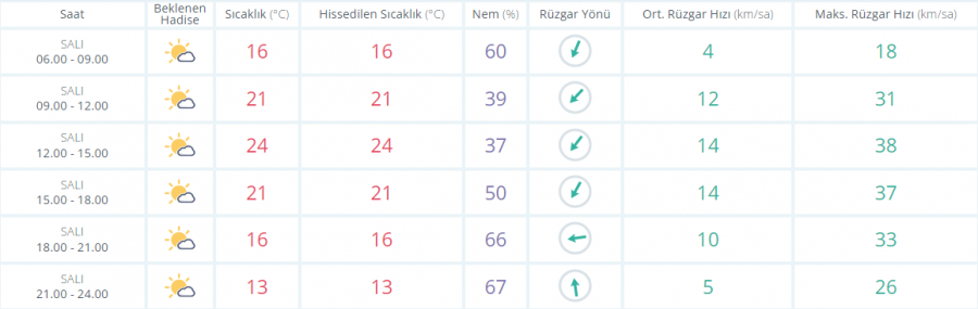 Hava Durumu: Parçalı ve az bulutlu; Rüzgar: Batı Akdeniz'de batı ve güneybatıdan, doğusu kuzeybatıdan 2 ila 4; Doğu Akdeniz'de batı ve güneybatıdan, doğusu kuzeybatıdan 2 ila 4, akşam saatlerinden itibaren 3 ila 5 kuvvetinde, Dalga: 0,5 ila 1,5 m, doğusu akşam 1,0 ila 2,0 m; Görüş: İyi.