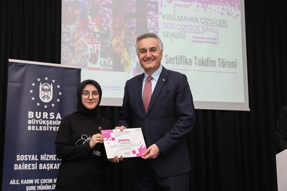 Dijital afiş sergisi kapsamında eser üreten öğrencilere, Atatürk Kültür Merkezi Merinos Yerleşkesi’nde düzenlenen törenle sertifikaları verildi. Programa, Bursa Büyükşehir Belediye Başkanı Mustafa Bozbey’i temsilen Bursa Büyükşehir Belediyesi Başkanvekili Mustafa Orkun Gazioğlu, okul yöneticileri, öğretmenler ve öğrenciler katıldı.