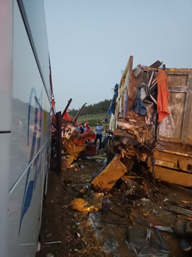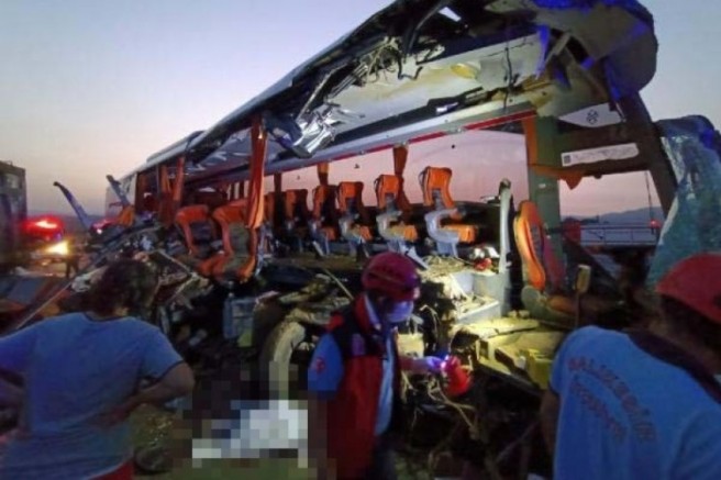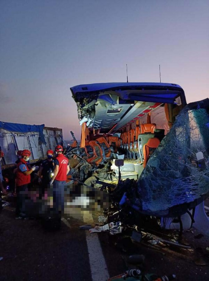 İstanbul-İzmir kara yolunda seyir halinde olan 55 AAD 477 plakalı yolcu otobüsü, sağ şeritte bekleyen Hasan K. idaresindeki 16 JNC 40 plakalı hafriyat kamyonunun römork kısmına çarptı.