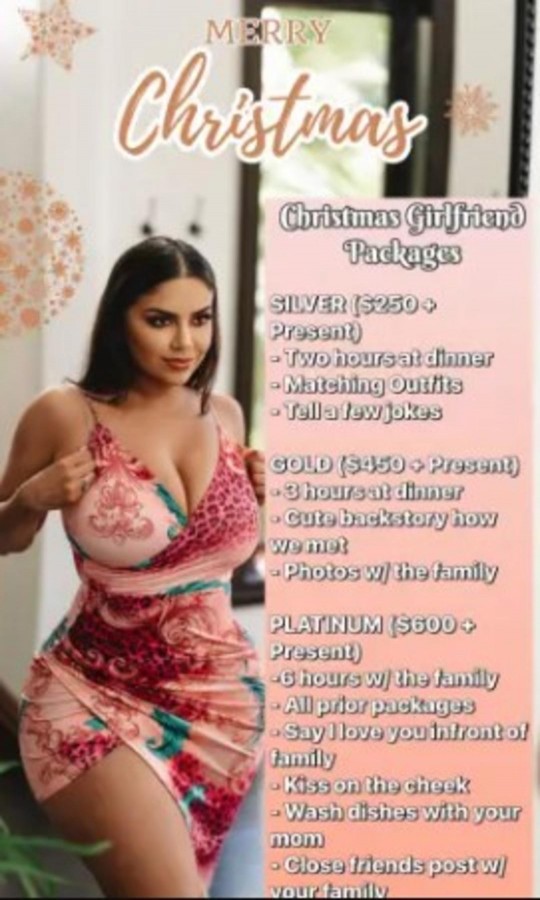 Sosyal medya fenomeni Jessenia Rebecca, sosyal medya üzerinden "Noel Kız Arkadaş Paketleri" adı altında yaptığı paylaşımla kısa sürede kullanıcıların ilgisini çekti. Fenomen ismin bazı hizmetlerinin saatlik ücreti 150 dolara (yaklaşık 5.220 TL) kadar çıkıyor. Rebbecca sosyal medyada üzerinden yaptığı paylaşımında "Noel Kız Arkadaş Paketleri" açıklamasını, "Bekar beyler için harika bir tatil hizmeti sağlıyorum" diyerek özetledi.