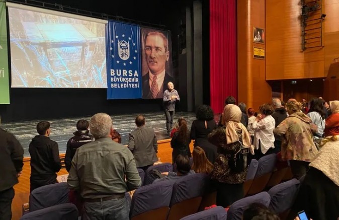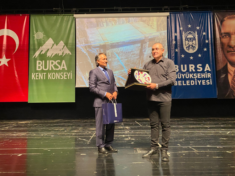 Programın sonunda Bursa Kent Konseyi Başkanı Ertuğrul Aksoy tarafından ünlü şair, yazar, araştırmacı ve tiyatro oyuncusu Sunay Akın’a günün anısına çini tabak hediye edildi.