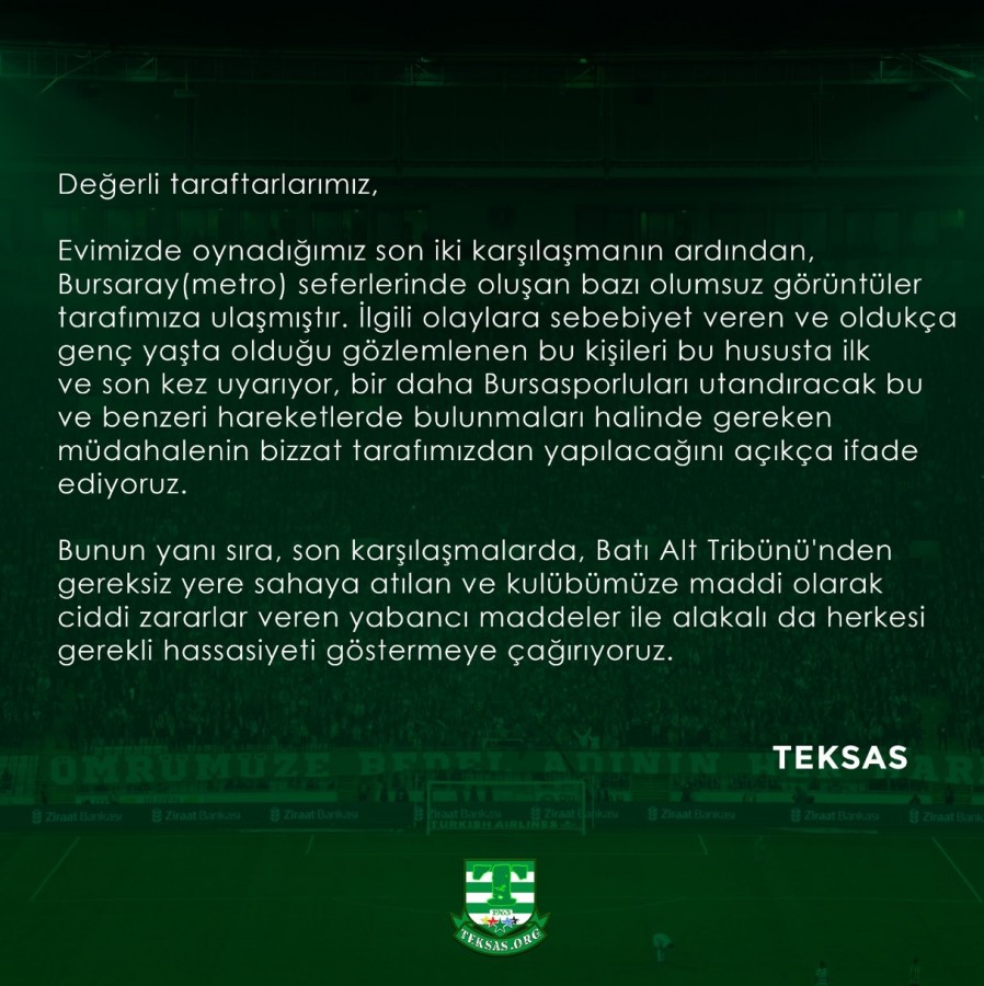 Evimizde oynadığımız son iki karşılaşmanın ardından, Bursaray (metro) seferlerinde oluşan bazı olumsuz görüntüler tarafımıza ulaşmıştır. İlgili olaylara sebebiyet veren ve oldukça genç yaşta olduğu gözlemlenen bu kişileri bu hususta ilk ve son kez uyarıyor, bir daha Bursasporluları utandıracak bu ve benzeri hareketlerde bulunmaları halinde gereken müdahalenin bizzat tarafımızdan yapılacağını açıkça ifade ediyoruz.