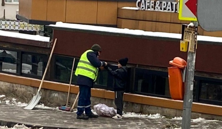 Bursa'da Erikli Meydanında Yıldırım Belediyesinde görevli bir temizlik personeli, temizlik yaptığı esnada, çöpten hurda toplayan bir çocuğu fark etti. Çocuk üşümesin diye elinde bulunan eldivenleri çıkaran temizlik görevlisi, eldivenleri küçük çocuğun ellerine giydirdi. O anlar bir vatandaş tarafından görüntülendi.