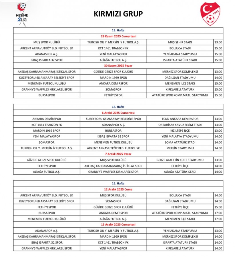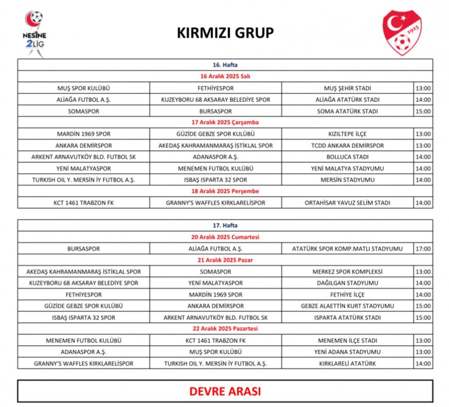 TFF 2. ve 3. lig maçlarının 2 hafta ertelenmesinin ardından yeni takvimi duyurdu. TFF 2. lig maçları 29 Kasım 2025 tarihinde başlayacak ve 22 Aralık 2025 tarihinde ise devre arasına girecek. Bursaspor, 13. hafta Fethiyespor, 14. hafta Mardin 1969 Spor, 15. hafta Ankara Demirspor, 16. hafta Somaspor ve ilk devrenin son maçını 17. haftada Aliağa Futbol A.Ş. ile oynayacak.