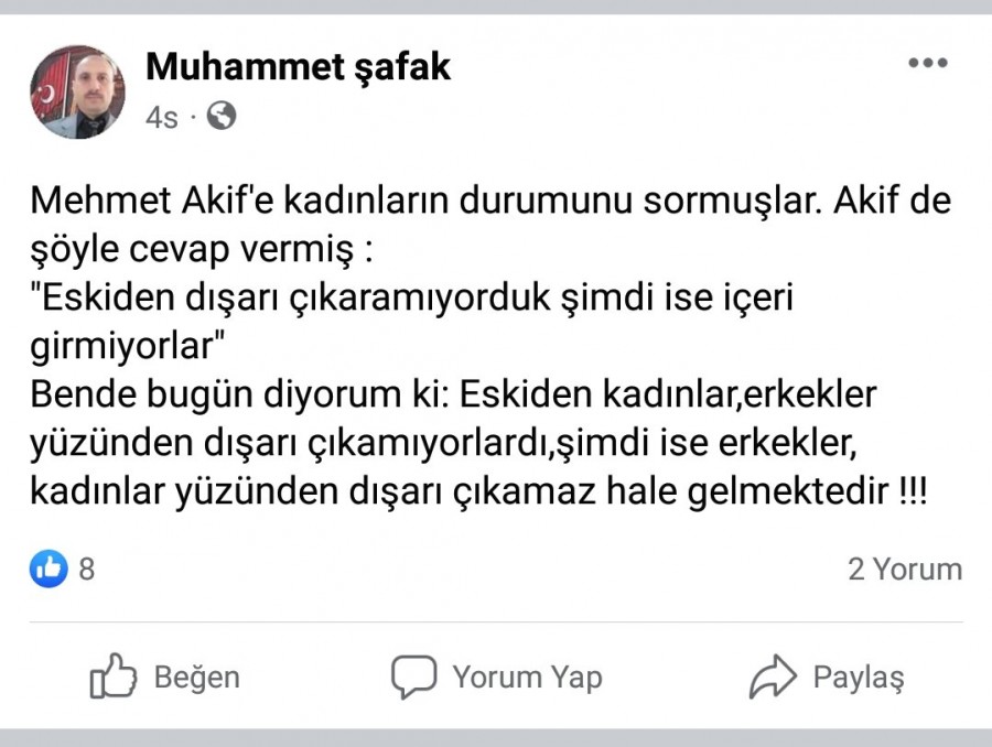 Trabzon'da Yıldızlı TOKİ Ortaokulu Din Kültürü ve Ahlak Bilgisi Öğretmeni Muhammet Şafak, sosyal medya hesabından Mehmet Akif Ersoy'dan alıntı yaparak kadınlarla ilgili tepki çeken bir paylaşım yaptı.