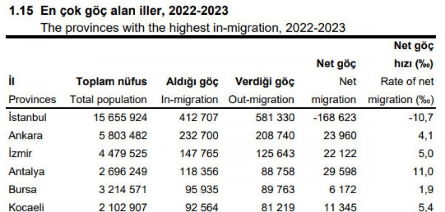 TÜİK verilerine göre İstanbul'da 2022-2023 döneminde 15 milyon 655 bin 924 kişi yaşıyor. Verilere göre İstanbul, bu dönemde 412 bin 707 kişi göç aldı ve 581 bin 330 göç verdi. Ve böylece İstanbul'da 2022-2023 dönemindeki göç 168 bin 623 kişi geriledi.