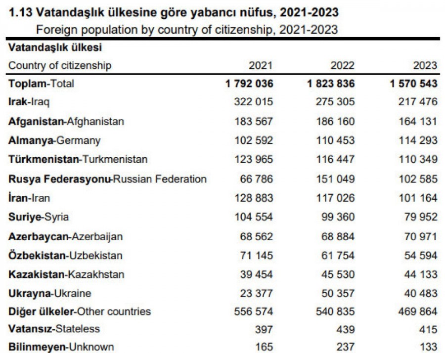 İstanbul'dan sonra en çok göç alan şehirler listesinde sırasıyla Ankara, İzmir, Antalya, Bursa ve Kocaeli geliyor. İstanbul'da net göç hızı yüzde 10,7 olarak ölçülürken, diğer şehirlerdeki oran pozitif olarak seyrediyor. Rapora göre, 2021-2023 arasında Türkiye'de 1 milyon 570 bin 543 yabancının arasında 217 bin 476 kişi ile Irak vatandaşları birinci sırada. İkinci sırada, 164 bin 131 kişi ile Afganistanlılar var. Suriyeliler ise 79 bin 952 kişi ile listenin beşinci sırasında yer alıyor.